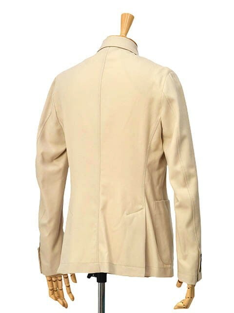 副資材を極力排したカジュアル仕立てではございますが、袖が動かしやすい前肩仕様はもちろん、ラペルのエレガントな曲線や、胸元のバルカポケット等、立体的に構築されたパターンは本格ジャケットと呼ぶにふさわしいクオリティが確かな実力を物語ります。