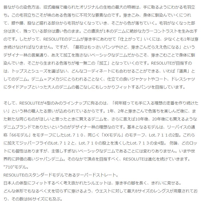 RESOLUTE【リゾルト】とは、「DENIME【ドゥニーム】」の創始者として知られるデニム・デザイナー林芳亨(はやしよしゆき)氏が手がける、世界に通用する"メイド・イン・ジャパン"のデニムブランド。「RESOLUTE」は、英語で「毅然たる」「意志の強い」「断固とした」を意味します。林氏がこの20年目にして見えてきたと言うデニムの理想は、まず生地が特徴。日本屈指の職人と組み、旧式の染色方法、織機で完成させた生地には他とは全く違う毛羽立ち・ザラつき感があります。