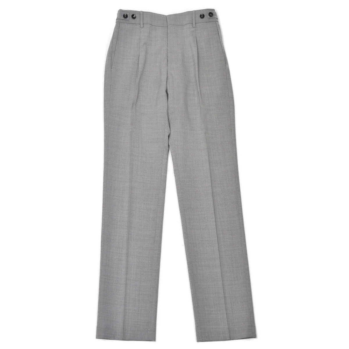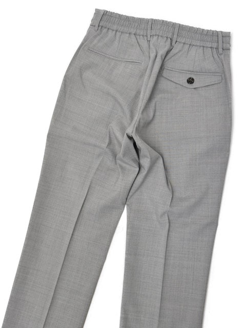 腰回りにややゆとりを持たせたワンプリーツ仕様で、ウエスト部分はゴムシャーリング、さらにサイドアジャスターとベルトループも付いたフル装備な一本です。