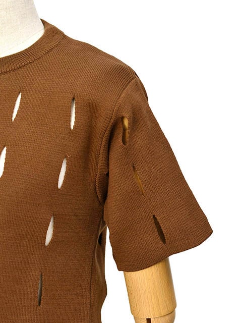 身頃、袖全体に施された穴あきデザインが印象的なニット。