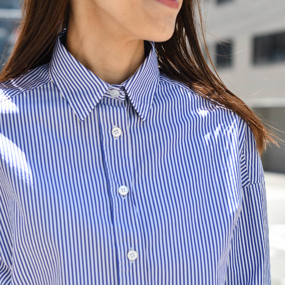 熟練したシャツ職人の手縫いによる、たっぷりとイセ込んだ肩と、自然なカーブを描く立体的な袖付けで、ビッグシルエットな一着もスッキリとした印象で上品な女性らしさを失わず気負わないラフなデイリースタイルを演出してくれる1枚に仕上がっています。