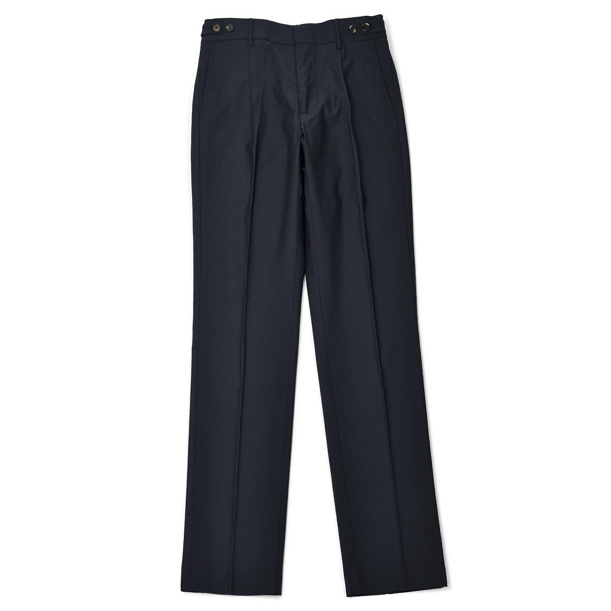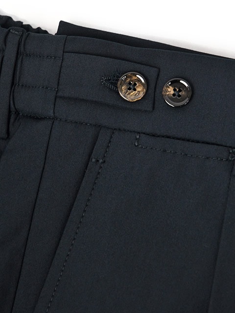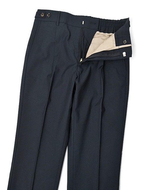 腰回りにややゆとりを持たせたワンプリーツ仕様で、ウエスト部分はゴムシャーリング、さらにサイドアジャスターとベルトループも付いたフル装備な一本です。