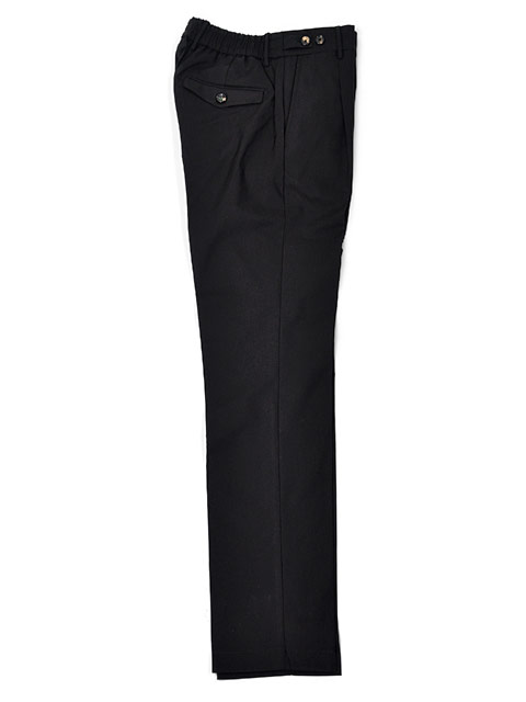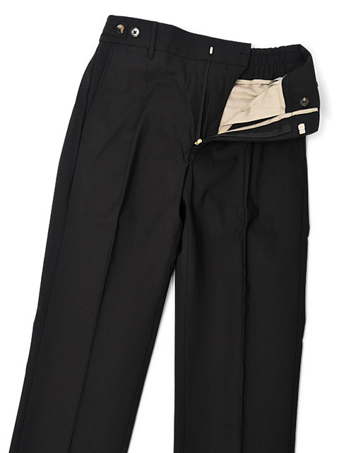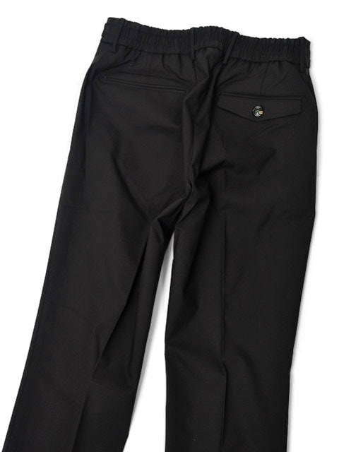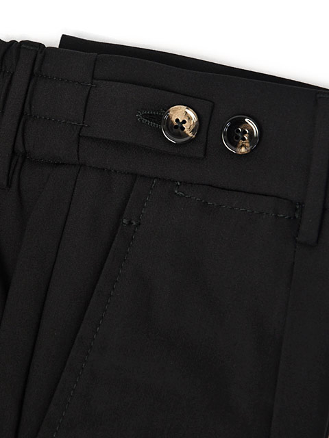 腰回りにややゆとりを持たせたワンプリーツ仕様で、ウエスト部分はゴムシャーリング、さらにサイドアジャスターとベルトループも付いたフル装備な一本です。