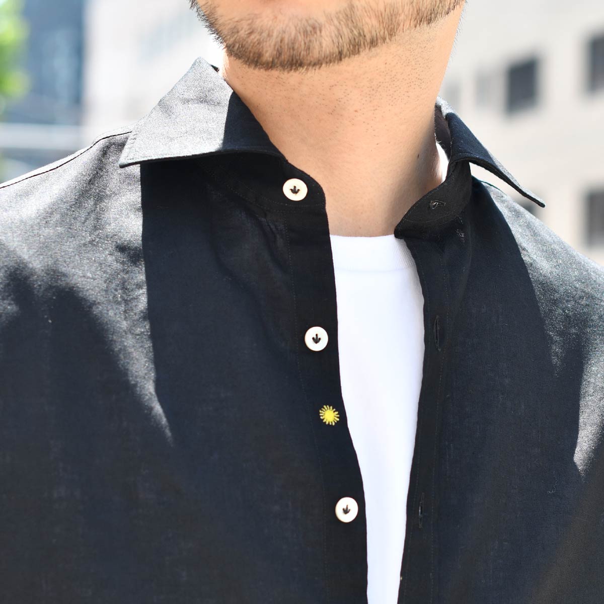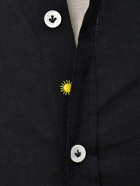 シャツの第2、第3ボタンの間にブランドアイコンの太陽のマークが付いておりチラッと覗く太陽のマークもアクセントとしても大活躍して頂けます!