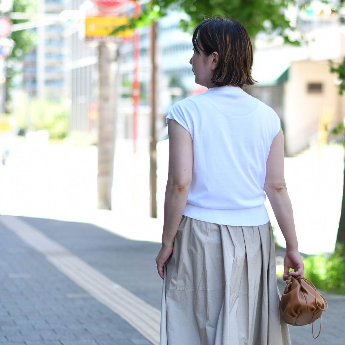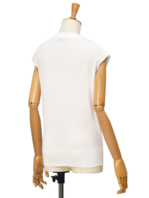 ボディーは程よくゆとりのあるモダンなシルエットでTシャツの袖を真っ直ぐにカットしたような袖口の仕様です。 タンクトップよりもボディラインや肩周りがカバー出来るため、普段ノースリーブに抵抗がある方にもお勧めのデザイン。