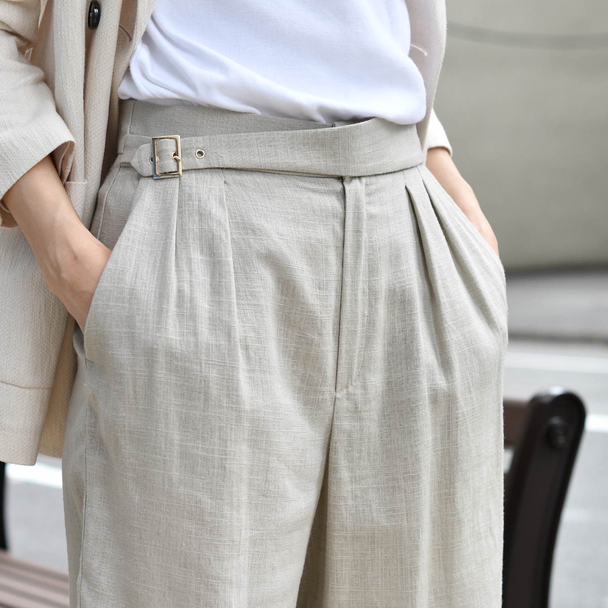 ビスコース特有のドレープ感と、麻の特性がかみ合ったエフォートレスな一着です。