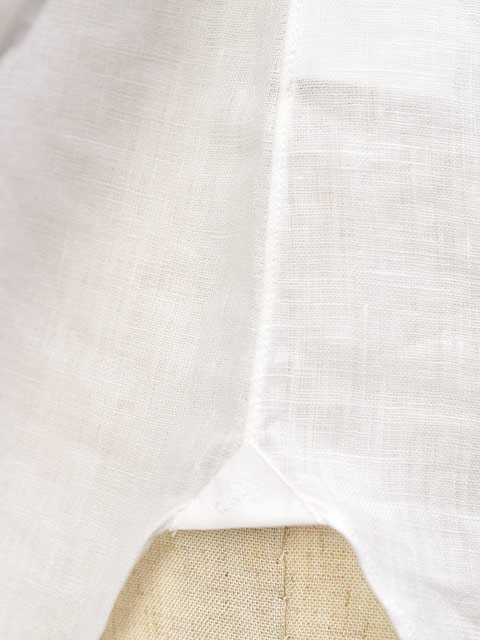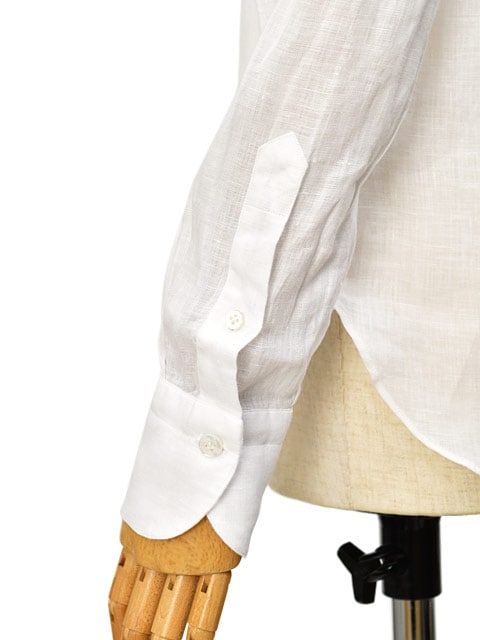 ナポリ出自のシャツらしく、手縫い仕立てによる細かい袖と背中のギャザーが後見姿を美しく見せ、また肩の運動量を妨げず柔らかな着心地。