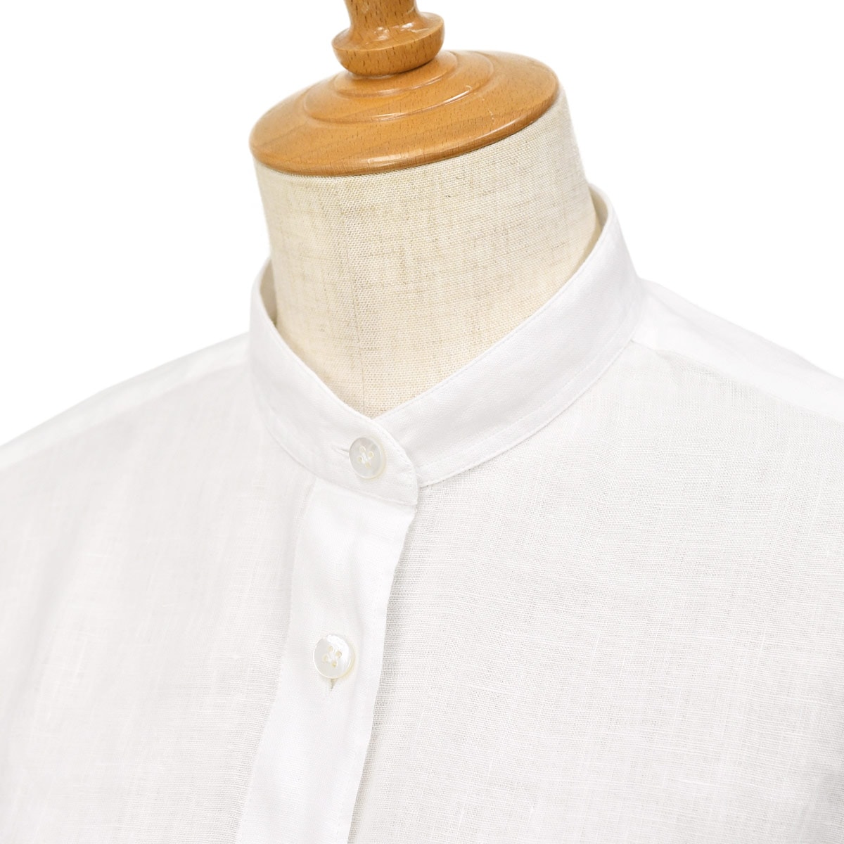衿型は、バンドカラー「PENNY(ペニー)」。パッと見の印象を左右する衿元は、小さくてコンパクトな衿でお顔回りがスッキリ見える形です。