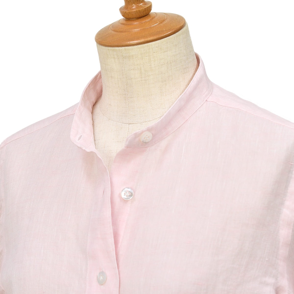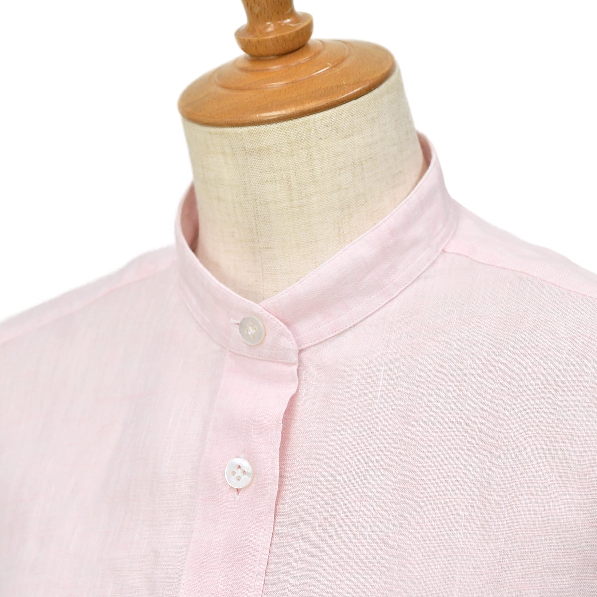 衿型は、バンドカラー「PENNY(ペニー)」。パッと見の印象を左右する衿元は、小さくてコンパクトな衿でお顔回りがスッキリ見える形です。