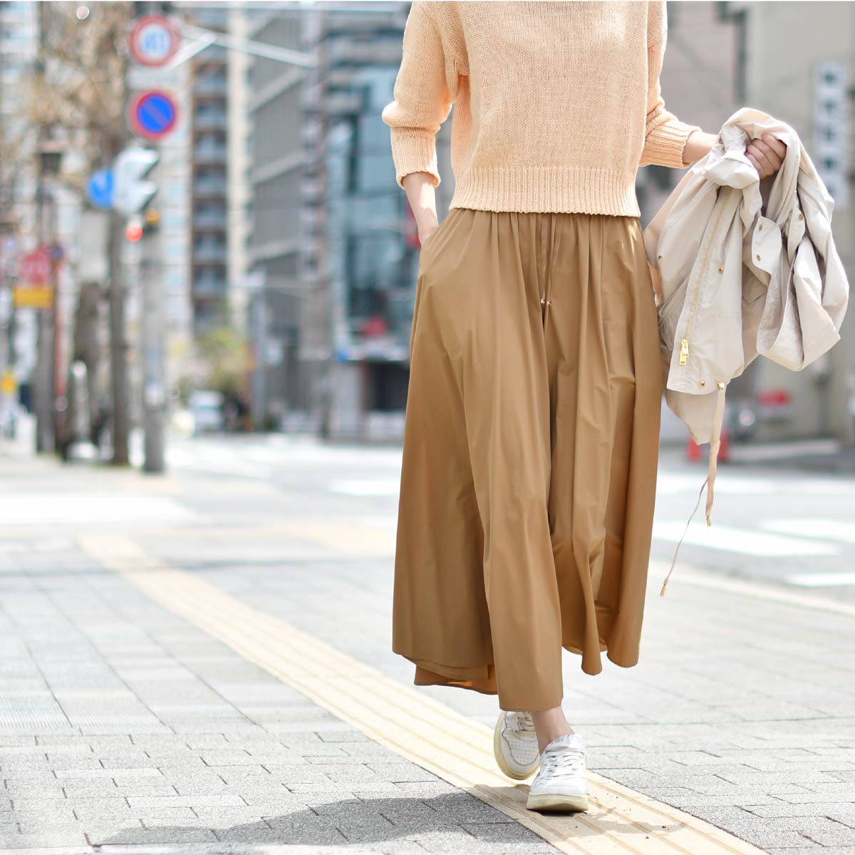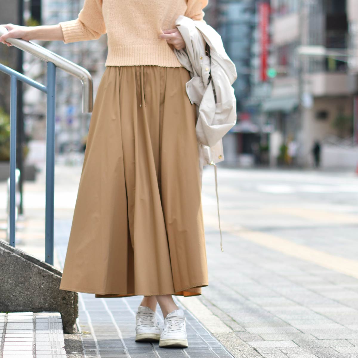 ドライタッチで マットな表情の薄く柔らかい質感の新素材ロングスカート。