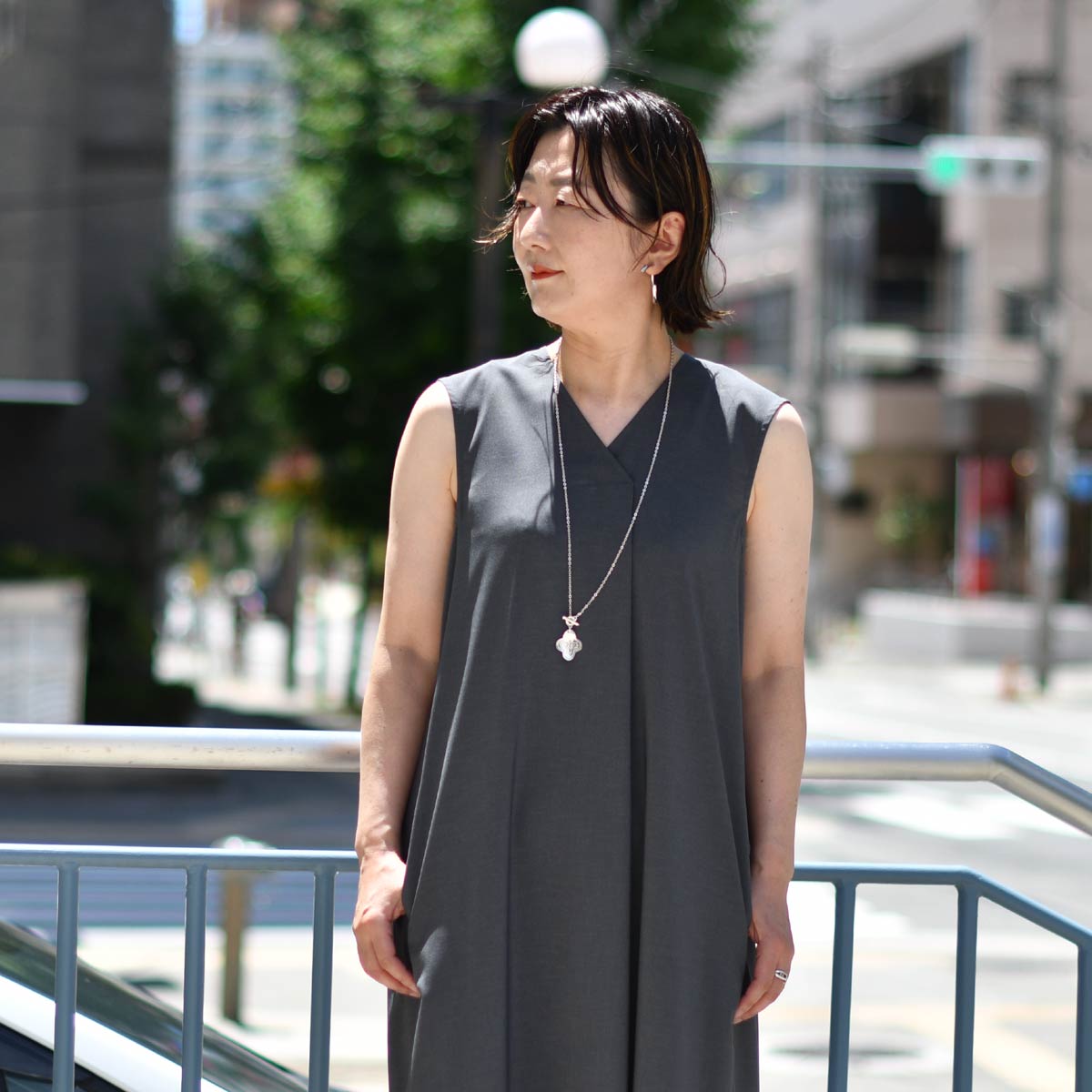 締め付けのないAラインシルエットですので、一枚でもサマになり