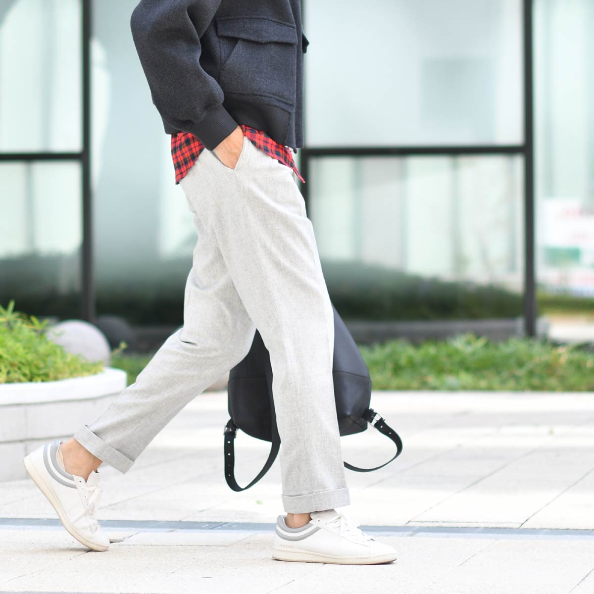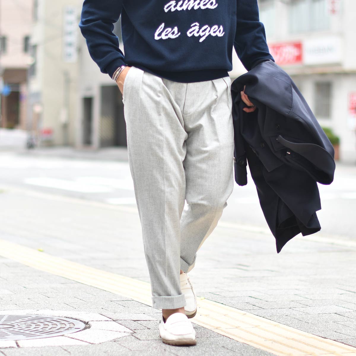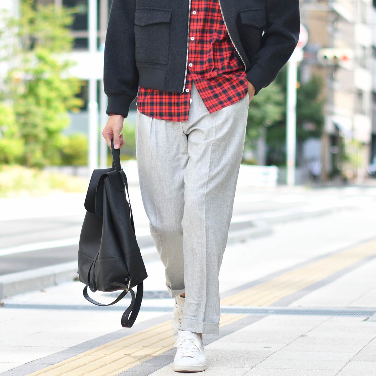 また、裾にかけて細くなるテーパードシルエットが絶妙で、足元の裾回りをスッキリ見せ、プリーツパンツであっても太くなり過ぎないメリハリのある着こなしが可能となり、プリーツパンツ初心者の方でもチャレンジし易いと評判です。
