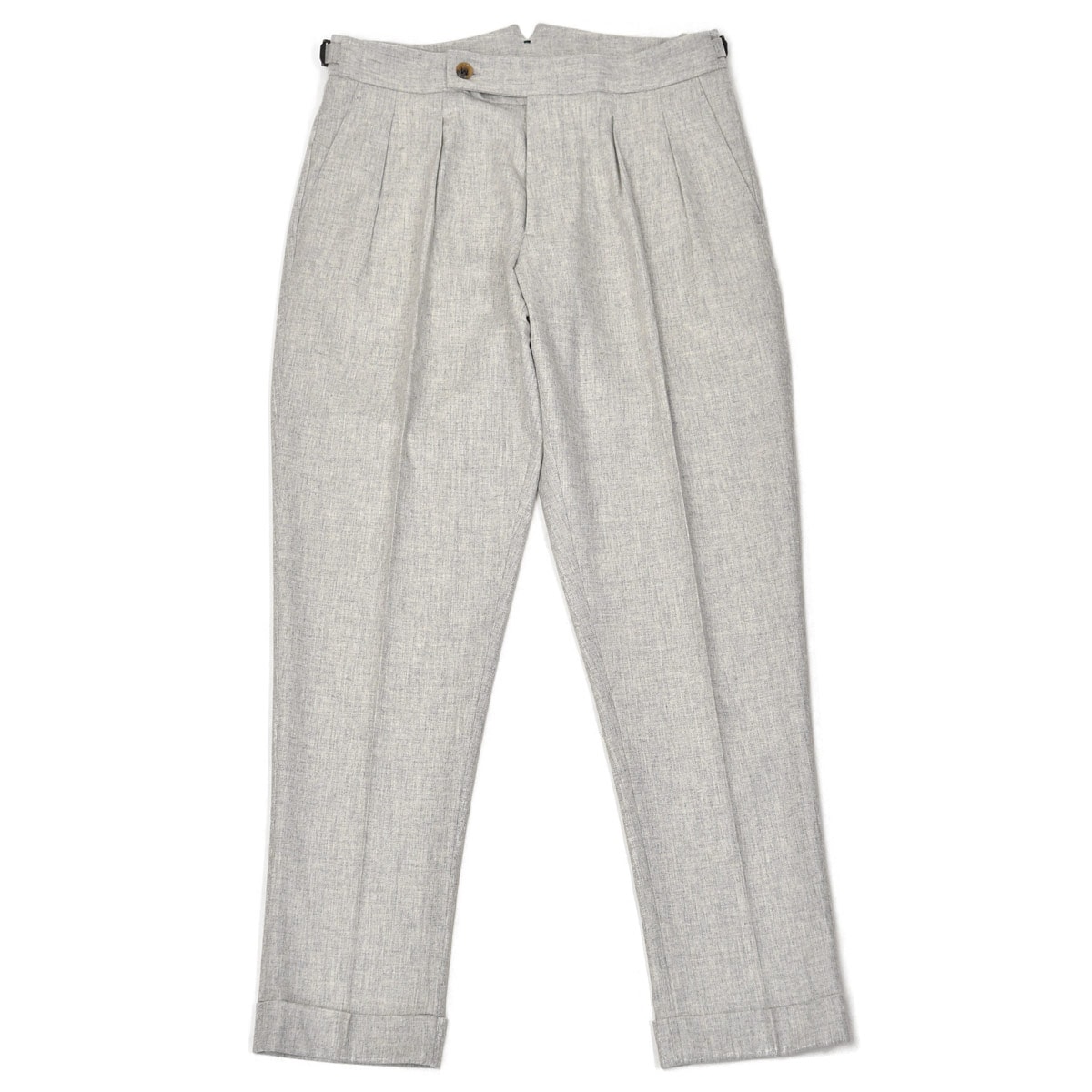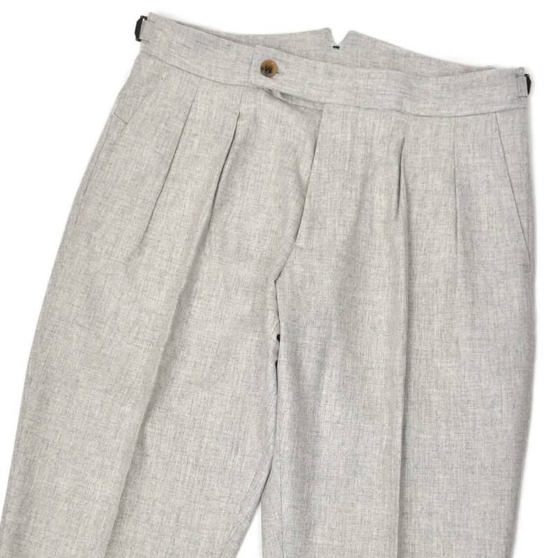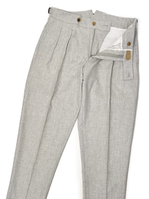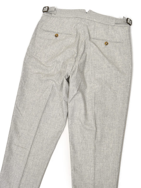 裾は当初からダブル仕上げのデザインで、やや短めのクロップド丈をチョイスしていただくと、より一層軽やかな印象となり、プリーツパンツをさり気なく軽やかに見せる為のおススメの着こなし方法です。