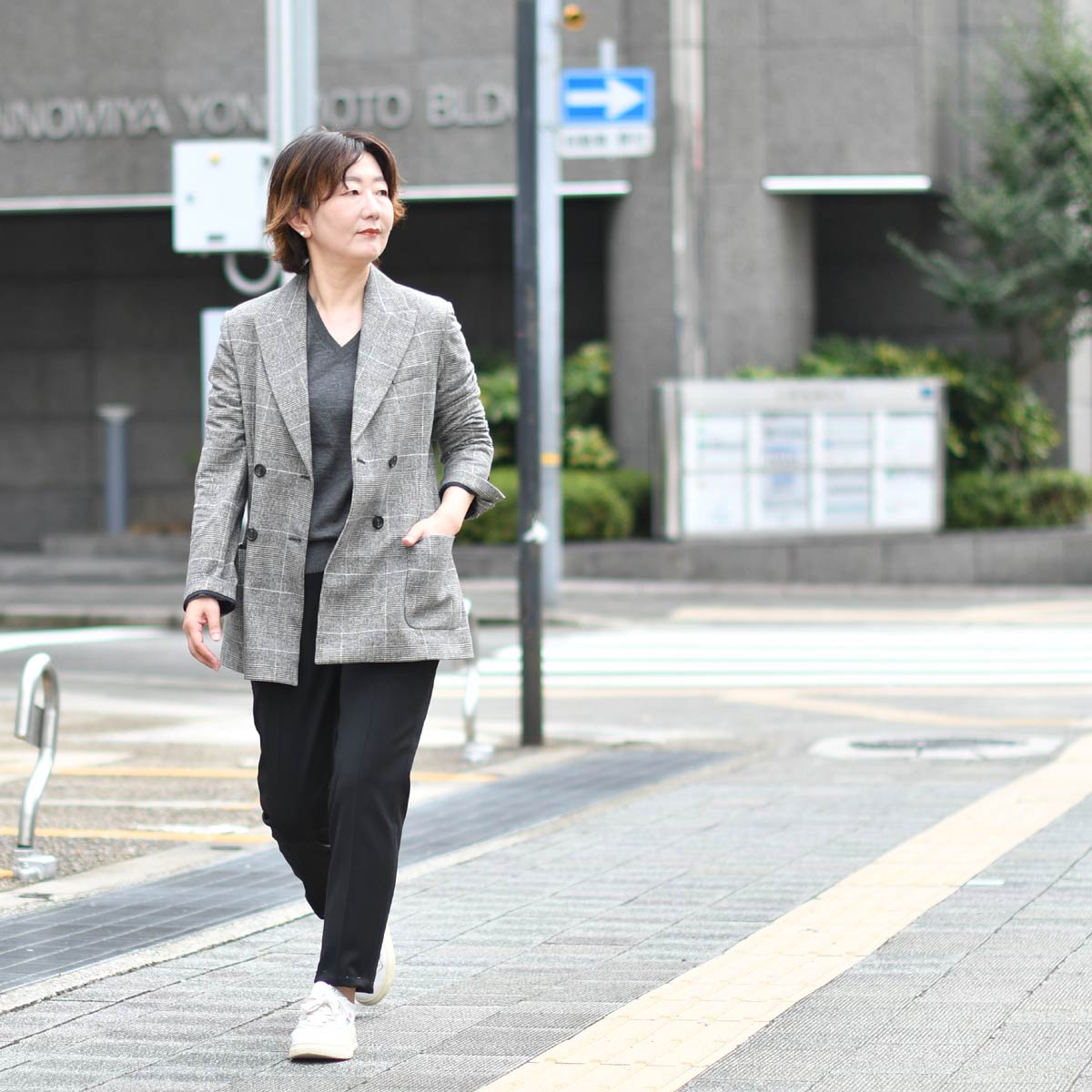 マニッシュな雰囲気がありつつエレガントさも漂うダブルブレストのジャケットは