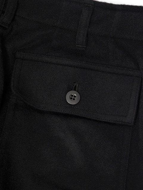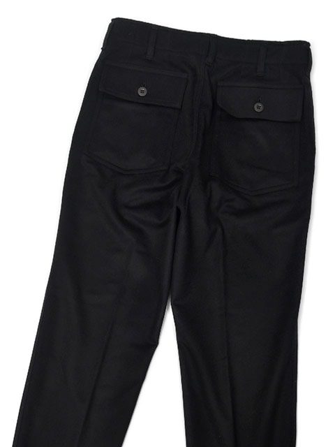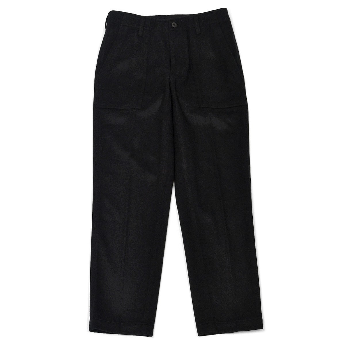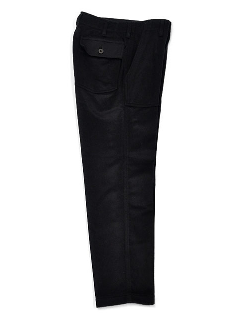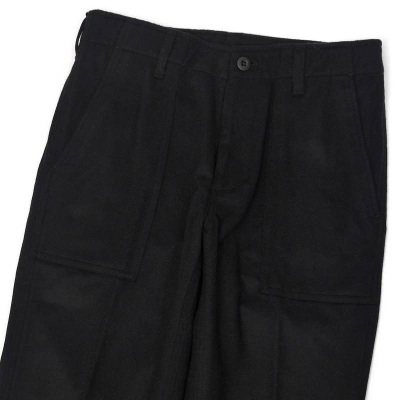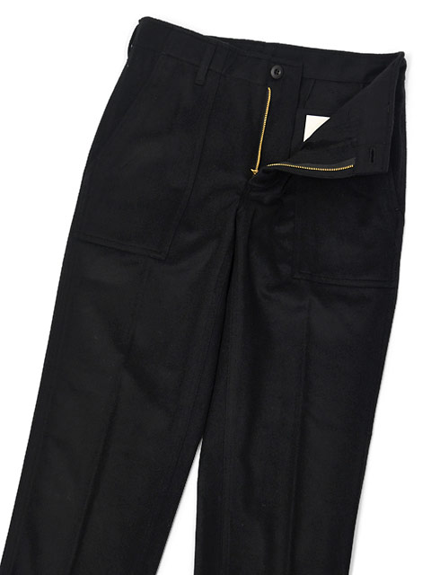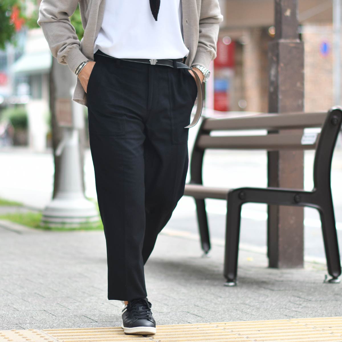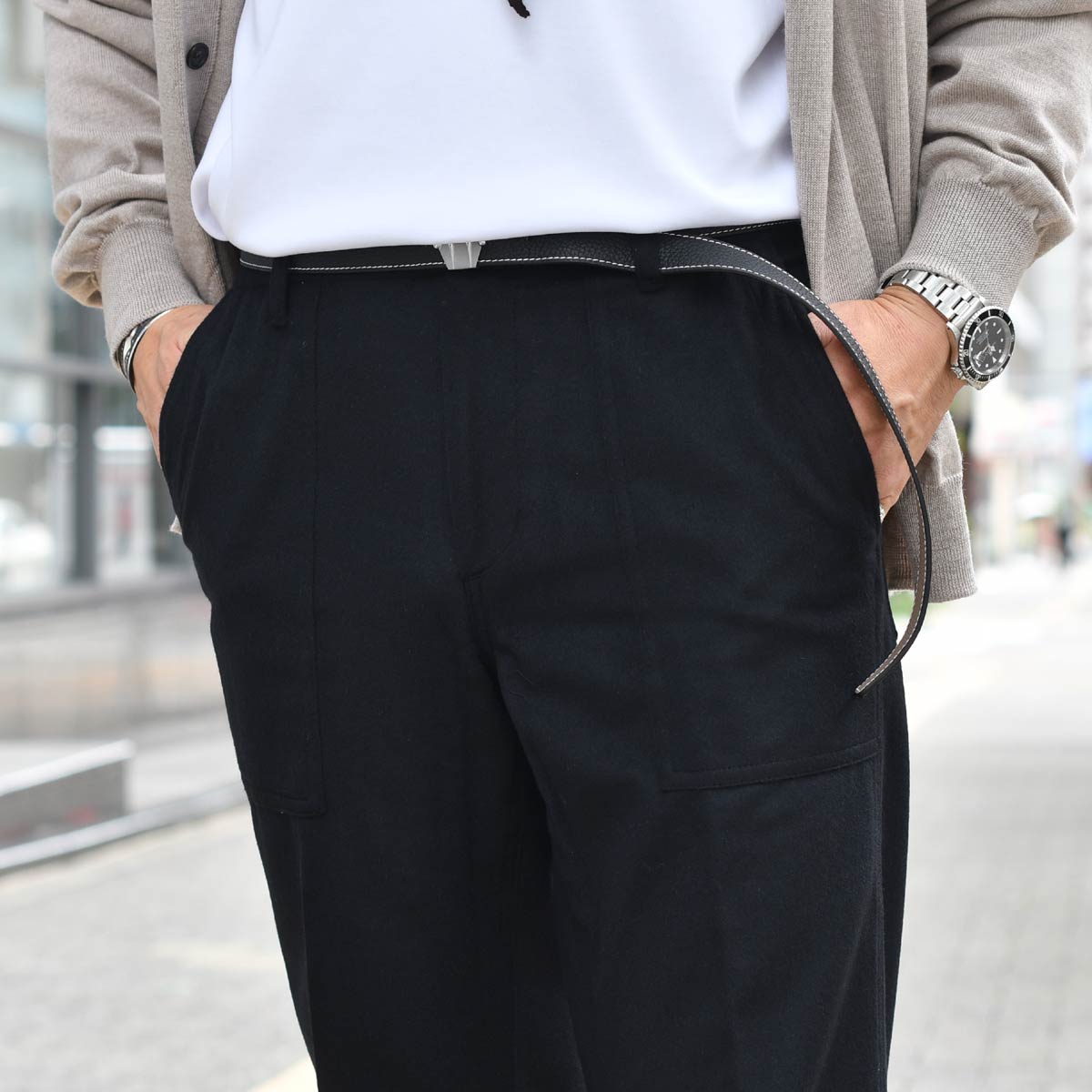 ご紹介は、ミリタリーパンツとして人気を博すファティーグパンツ(ベイカーパンツ)からウールカシミヤ素材で登場。 起毛感のあるウールカシミヤはやや薄手で滑らかな手触りが特徴。