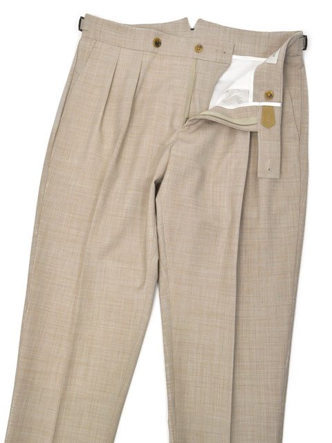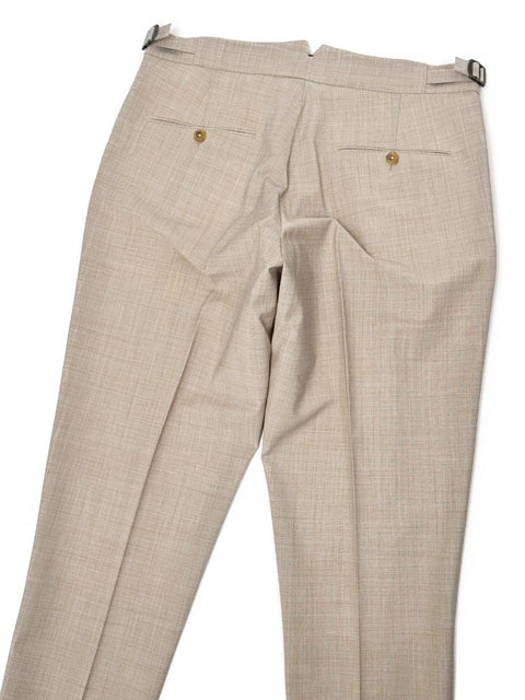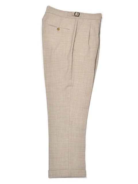 裾は当初からダブル仕上げのデザインで、やや短めのクロップド丈をチョイスしていただくと、より一層軽やかな印象となり、プリーツパンツをさり気なく軽やかに見せる為のおススメの着こなし方法です。
